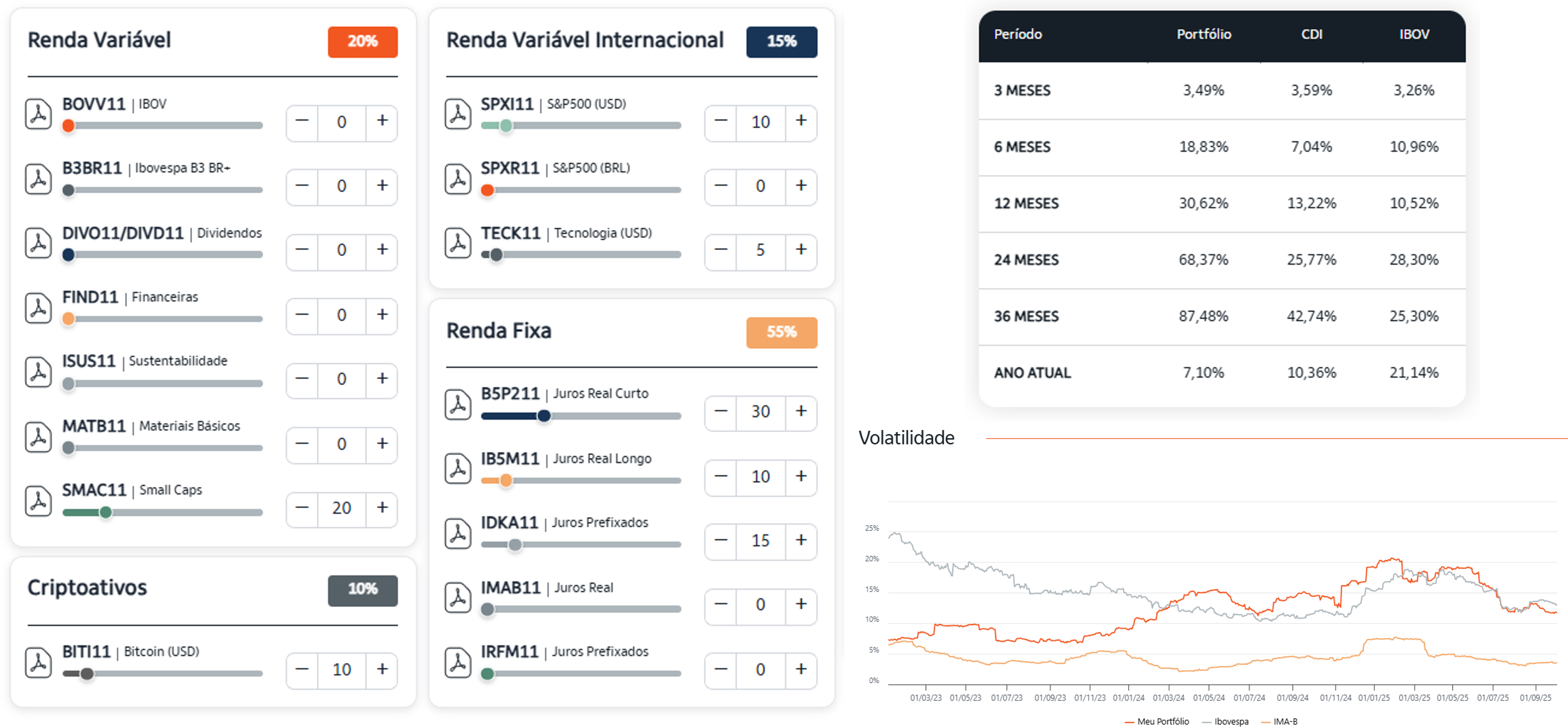 - Táticas (small caps, ouro, até cripto como bitcoin, conforme perfil).
